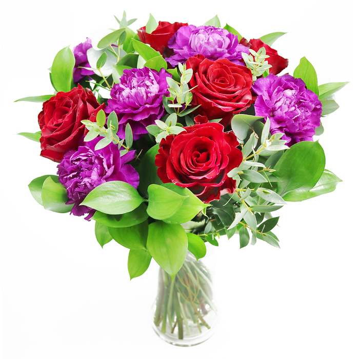 Charming Elegance: This elegant bouquet showcases beautiful red roses, vibrant cerise carnations, lush ruscus, and aromatic eucalyptus. Each flower is hand-selected to ensure exceptional quality and freshness, creating a unique and mesmerizing arrangement perfect for expressing your love.
