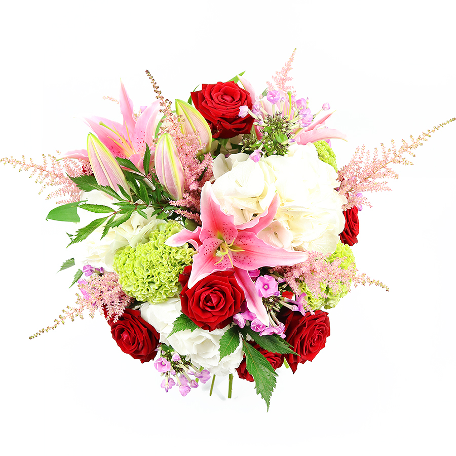 Discover the unique charm of our Radiant Blooms bouquet, featuring a vibrant mix of roses, lilies, hydrangeas, pink astilbe, and green celosia. Perfect for conveying heartfelt messages like "Thinking of You" or "I Love You".