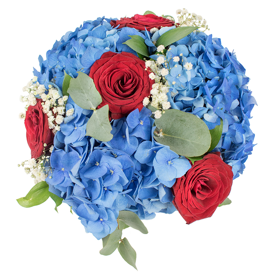 Share your affection with our beautiful bouquet that conveys, "You are cherished and loved." This lovely arrangement features fresh red roses, vibrant blue hydrangeas, and elegant gypsophila.